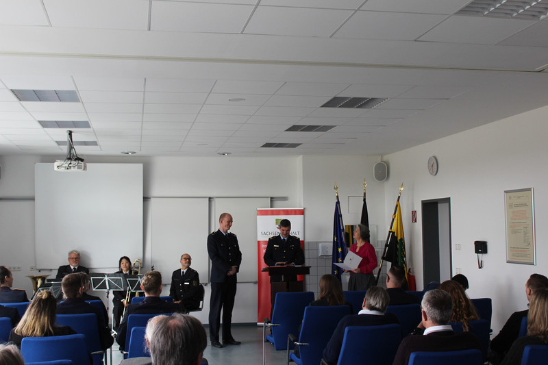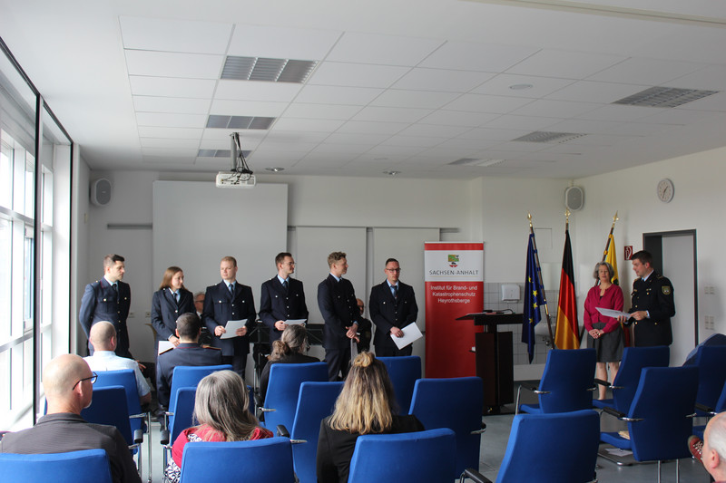 Im Rahmen einer feierlichen Veranstaltung wurden die Neuen im Team durch die Ministerin Dr. Tamara Zieschang sowie den Direktor des IBK Andreas Rößler offiziell begrüßt und in ihre jeweiligen Ämter ernannt. Ein Brandreferendar, vier Brandoberinspektorenanwärter und ein Brandmeisteranwärter wurden in das Beamtenverhältnis auf Widerruf berufen. Zudem wurden ein Brandrat sowie ein Brandoberinspektor nach erfolgreich absolvierten Laufbahnprüfungen zu Beamten auf Probe ernannt.